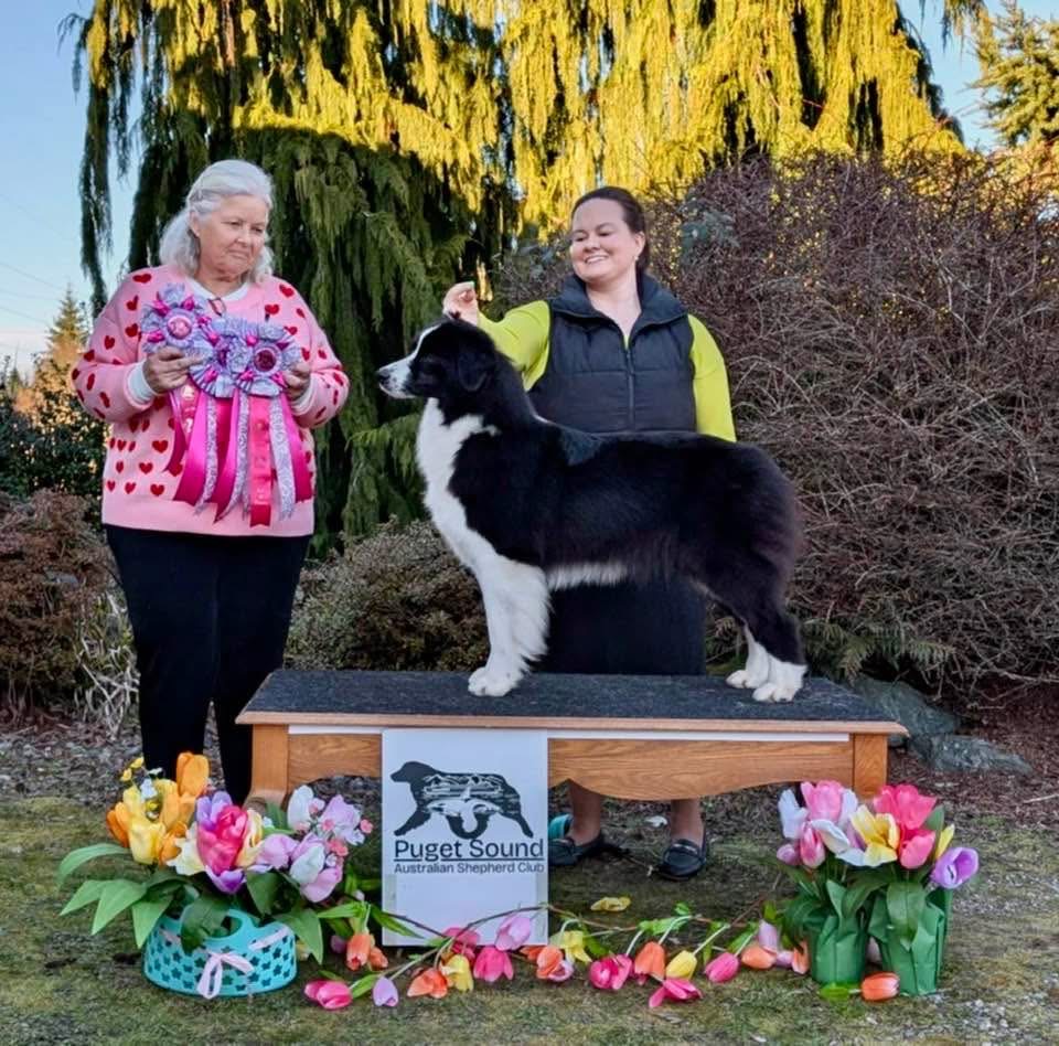This lovely black bi girl entered the Puget Sound Australian Shepherd Club’s Valentine weekend shows with a previous 5 point major. At the first show under Breeder Judge Phillip Peart Rita took Reserve Winners Bitch, the next day under AKC Judge Betty Winthers she took a 5 point major and at the last show she not only took another 5 point major but went on to take Best of Winners and Best of Breed over some lovely Specials to finish under SBJ Cheri Preciado! Watch for this lovely girl in upcoming performance events!